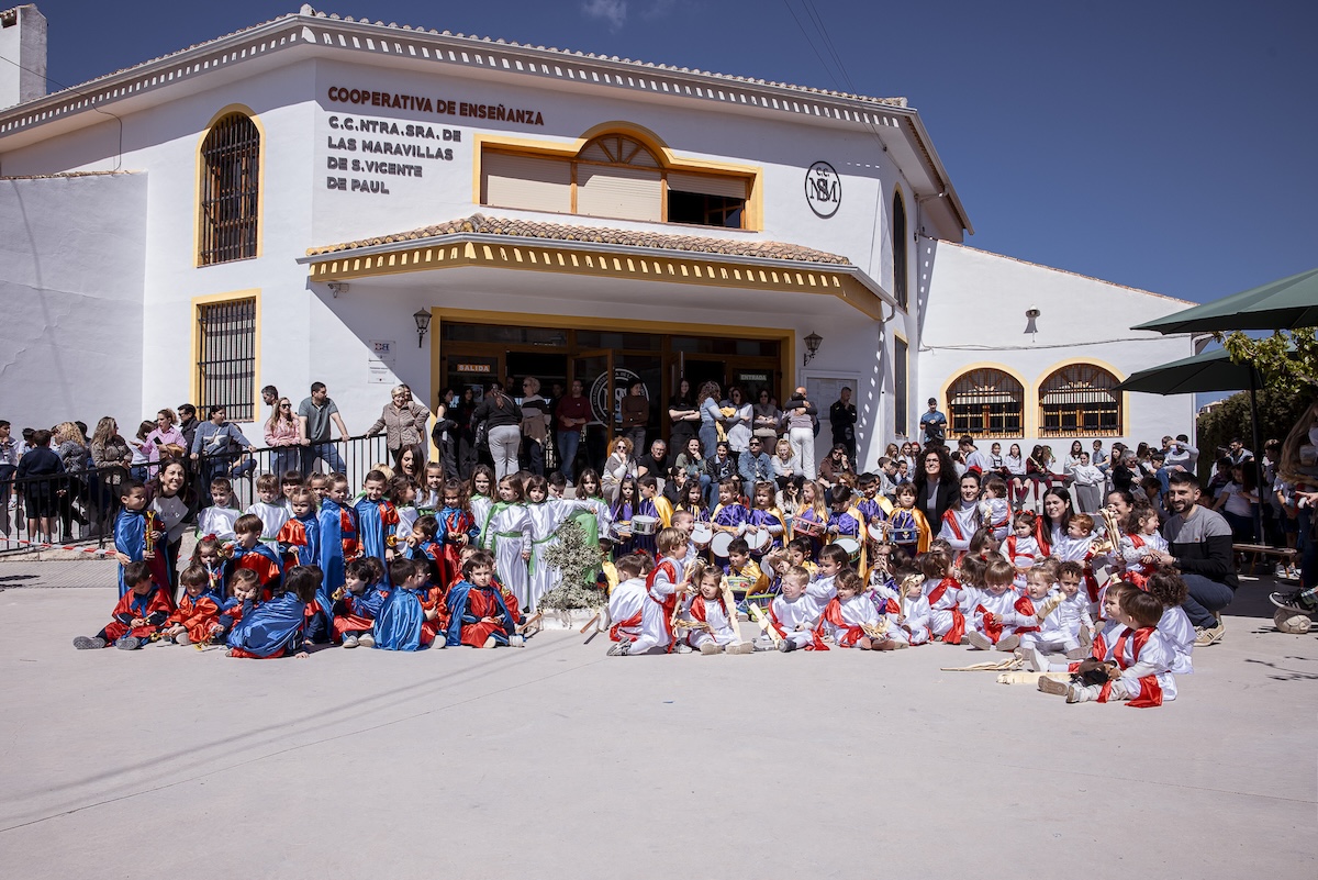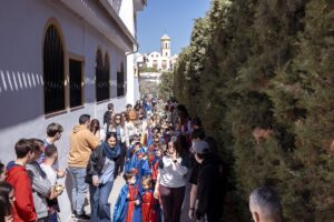Los protagonistas absolutos de la mañana son nuestros alumnos de Primer y Segundo Ciclo de Infantil. Con el apoyo de los padres, que asisten con orgullo a este desfile, y el alumnado de educación primaria, el patio se llena de colorido con las túnicas que representan nuestra identidad: blancos con mantos colorados, morados con capas doradas, colorados con capas azules y blancos con capas verdes.